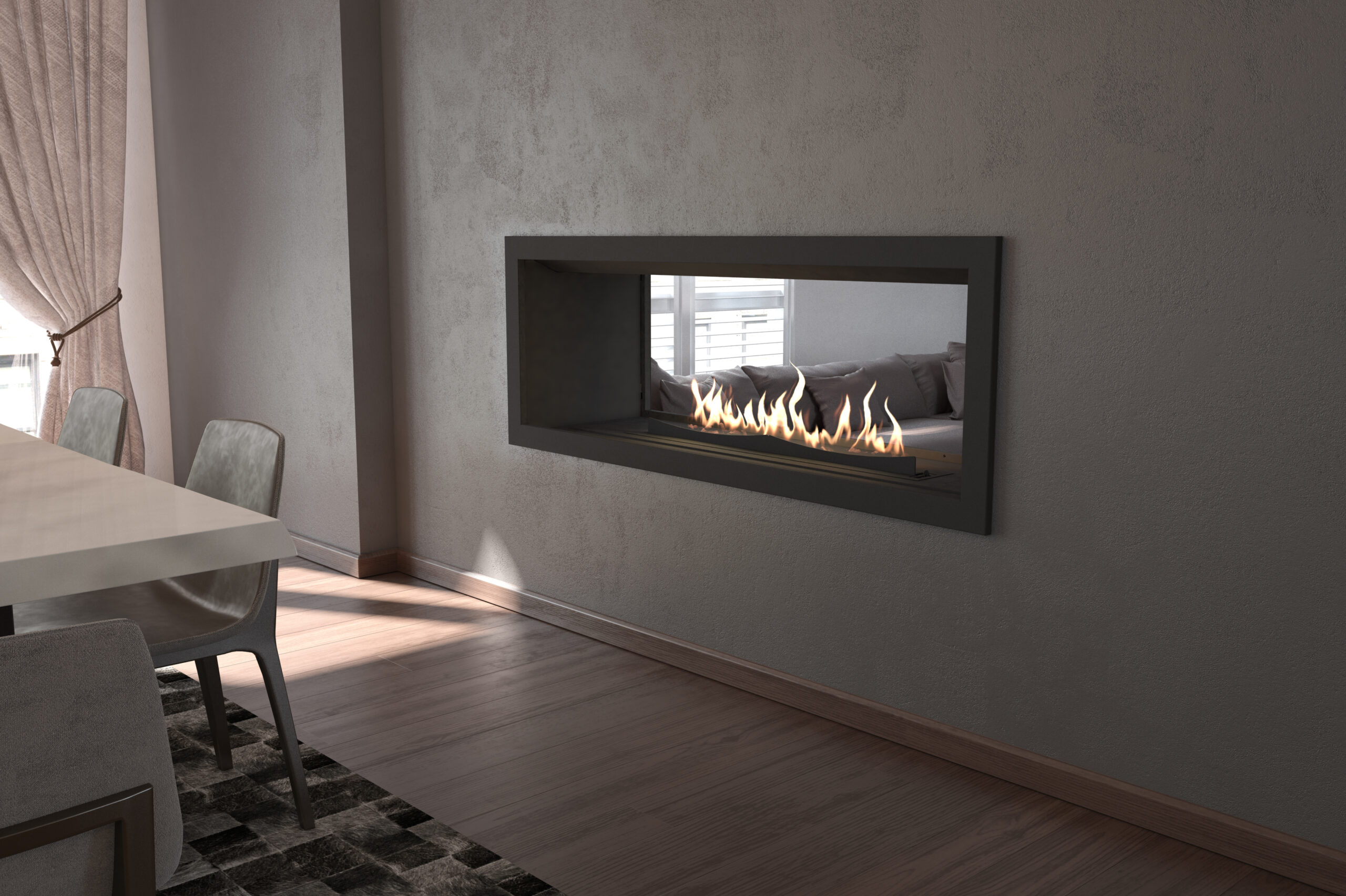 The double-sided flueless gas fireplace does not require a chimney and is one of the most efficient fireplaces available. Available in various sizes and finishes. Generally used to divide two rooms with the benefit of enjoying fire from both sides.